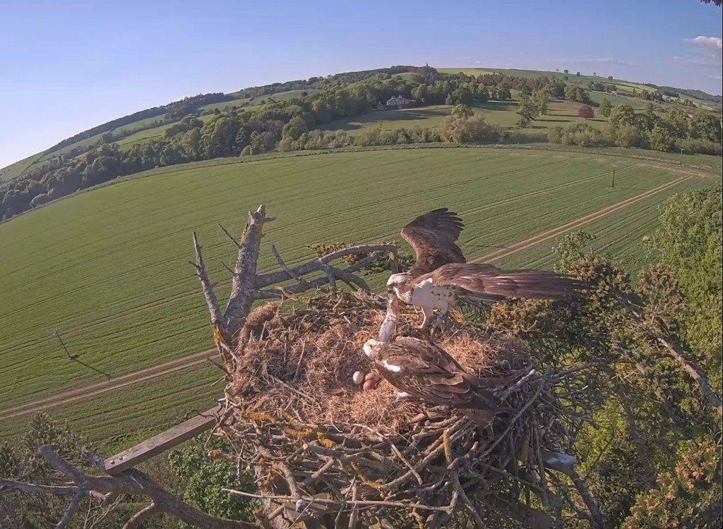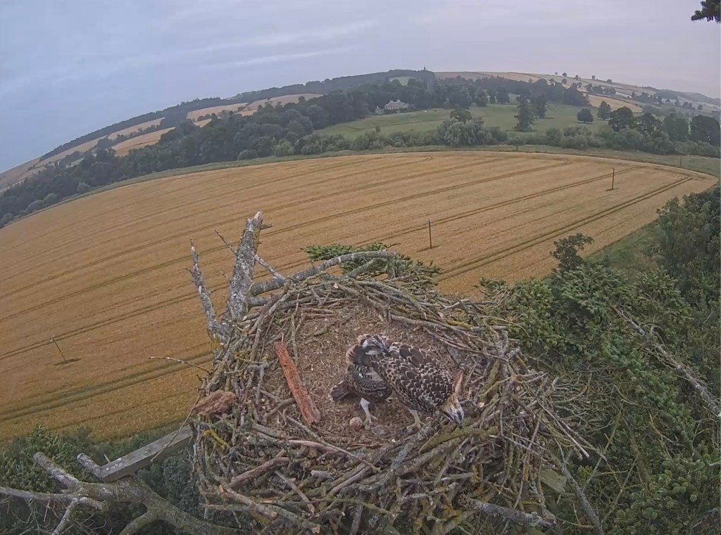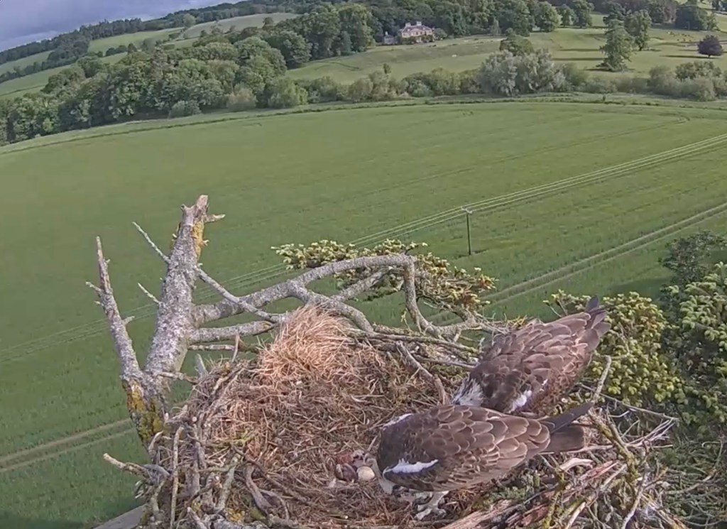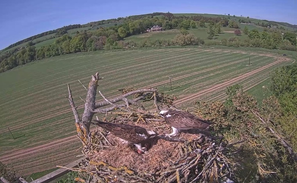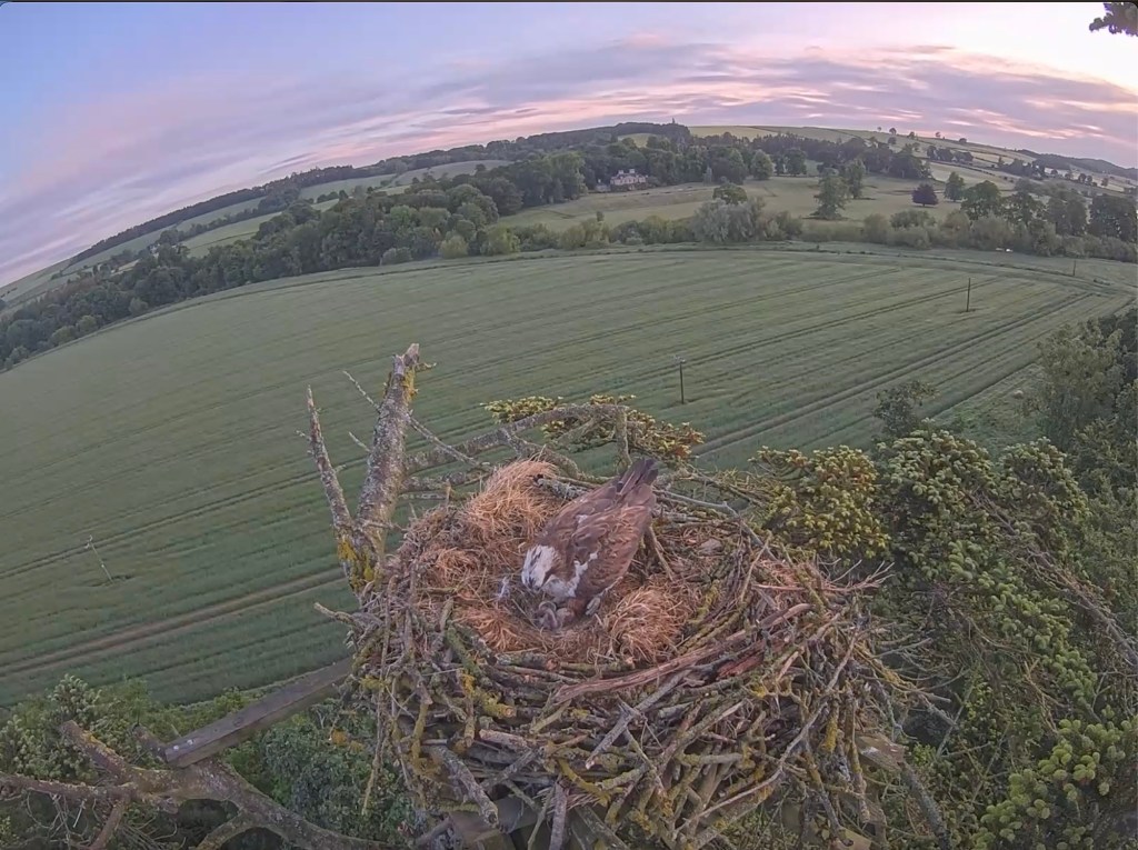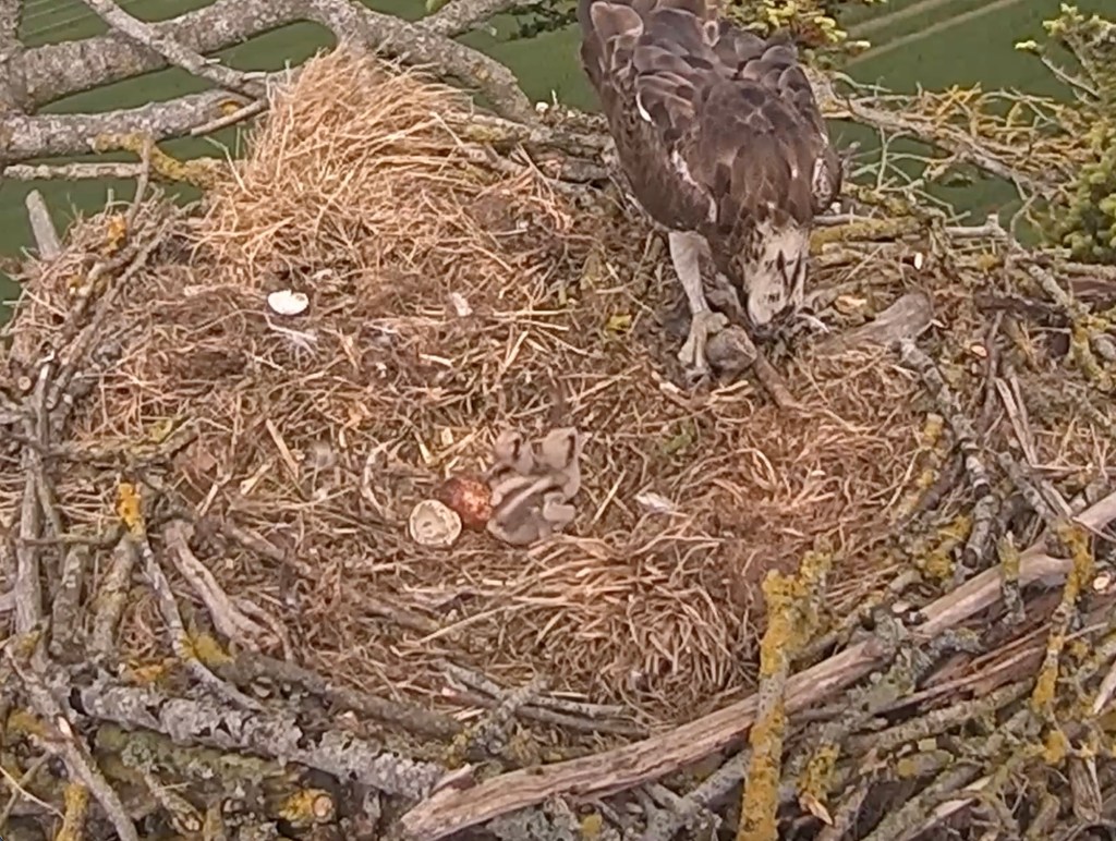 So it will be a 2 chick family and, although sad that the second egg did not hatch, I’m not unhappy that Augusta as a first time mum has only 2 chicks to rear. They both look strong and healthy and have a very experienced parent in Samson but there is little leeway for error in the life of a young osprey and we must hope that fortune favours them. In doing so, I would like to extend my condolences to my colleagues at Tweed Valley Osprey Project who sadly lost that incredible clutch which was incubated and would have been raised by the two females and possibly the absentee male. The combination of the male disappearing and the weather conditions making fishing so difficult was just too much for the family to survive. The margins are so small between success and failure. Fingers crossed our little family do well. The weather seems benign for the next few days, which is so important when they are so tiny and the fishing looks good. I will certainly keep you informed.