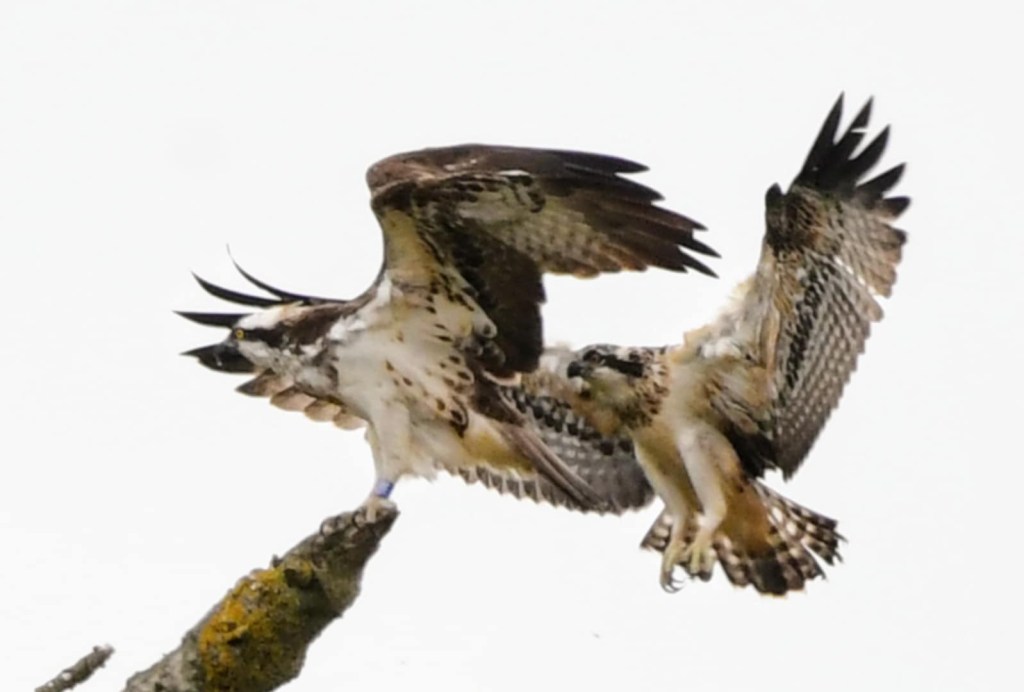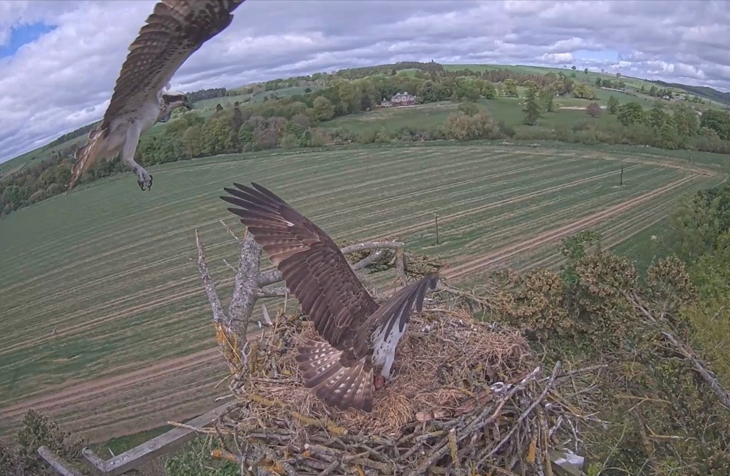 After much wing flapping, hovering and a fair bit of peering over the edge of the nest, C1 fledged today at 1348. Yesterday, she’d hovered straight up out of sight and onto the branch to which the camera is secured. That clearly took all of her courage and it was a good 90 minutes before she had enough confidence to lower herself back down onto the nest. For the rest of yesterday, her hovers were much more reserved but it was only a matter of timing for her today. It was virtually windless, so she was able to control her movements a lot better than yesterday and she spent the morning eating and building up her courage. A couple of lovely ladies from Hawick, who didn’t know about the ospreys here and had just come for a walk, came up to watch the screen and so were able to witness the magical moment of C1’s maiden flight. All 3 of us were on the edge of our chairs as she did a big jump across the nest, had a peer over the edge, a nice rouse of her feathers and then finally launched from the nest, to a cheer from us. She did a couple of circuits and I was touched to see that Samson, who was hiding away in one of his man sheds, immediately got airborne to monitor her flight and make sure she was safe. She came in a bit fast and with all talons extended, ready to grab whatever bit of nest she could, and landed right on Augusta’s back! There followed a bit of a scrabble as Augusta tried to get her off and C1 was determined not to unhook her claws from the safety of something solid. After getting her breath back, there was no stopping her and she spent the next hour or so doing circuits and practising a variety of landing techniques, before withdrawing, exhausted by the excitement, to the bottom of the nest for a snooze.