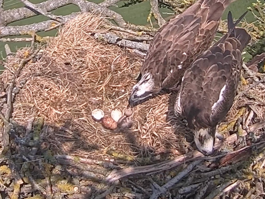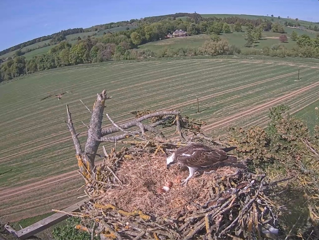 The standard day is that, shortly after the camera comes on at 0430, we usually see a shift change over as Samson comes in to relieve 500 (Augusta) who will have been incubating overnight. She usually disappears for about half an hour, for a wing and leg stretch and an opportunity to bathe, and there is then a period where the two of them swap and change over incubation duties and bring a few bits and pieces in just to add to the nest. He will often then disappear for a couple of hours before returning late morning. I expect he’s fishing but he doesn’t always return with a fish, so probably sometimes finds somewhere quiet to have his breakfast. If he does bring a fish back, she normally takes it, flies off to eat the first few bites and then returns to the nest perch to finish it off. He usually then does more of the incubating into the early afternoon while she spends a lot of the time sitting on the nest perch. He will go fishing again mid afternoon and usually brings back the largest fish of the day, after a couple of hours. He still has a tendency to be reluctant to hand this fish over, unless she is hungry and is quick off the mark, but if she is still full from the morning fish, she’ll let him have the major share. He’ll bring another fish in later on in the evening. We have been incredibly lucky with the weather so supplies have been good and both seem satisfied.