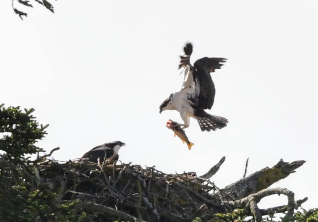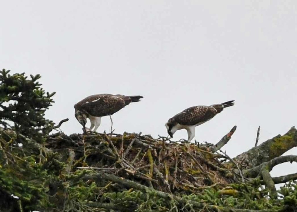 I’m delighted to report that everything is going well, so far, on our nest, with Samson supplying fish on a very regular basis and 500 (Augusta) quickly becoming proficient at feeding the bottomless pits that are their 2 chicks.