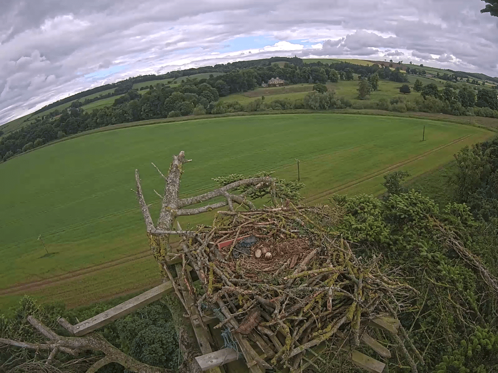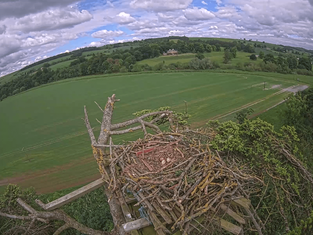 You will recall from my last blog how the bad weather meant that we lost the camera as the solar panels couldn’t charge and the battery went flat. We therefore couldn’t monitor fish deliveries but we knew they would be difficult in the pouring rain and flooded areas. We hadn’t seen a fish delivery on camera or by active monitoring for several days. On Tuesday, there was the incident I recounted whereby I’d hoped that there had been an off camera fish exchange. However, as soon as she returned to the nest, Augusta was immediately fish soliciting again. Samson went off fishing at about 0930 and wasn’t seen on camera again for 48 hours. When he returned, he went straight onto the nest and started incubating the eggs; there was no fish. Eventually she drove him off again and we didn’t see him on camera from another 24 hours (Friday) when he returned, again without a fish. In the meantime, Augusta was getting more and more anxious throughout Thursday morning (30th). She left for about 10 minutes and came back wet but, at 1158, after standing at the side of the nest looking at the eggs for several minutes (that broke my heart), she took off and we haven’t seen her since. The camera went off at 1800 and came on again at 0500 and the eggs had not been moved, suggesting that had been exposed the whole time. When he returned on Friday, they had probably not been covered for 21 hours and were therefore cold and unviable. He incubated them all day until just before the camera went off before departing. He was back again on Saturday and again incubated during the day but without any chance of success.