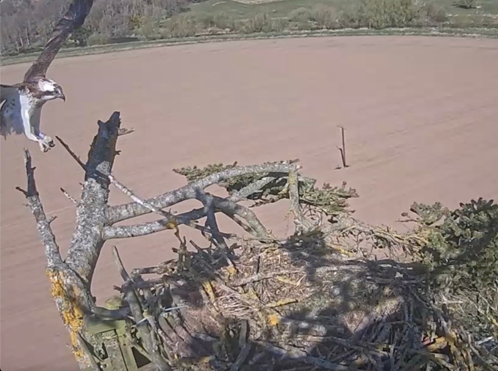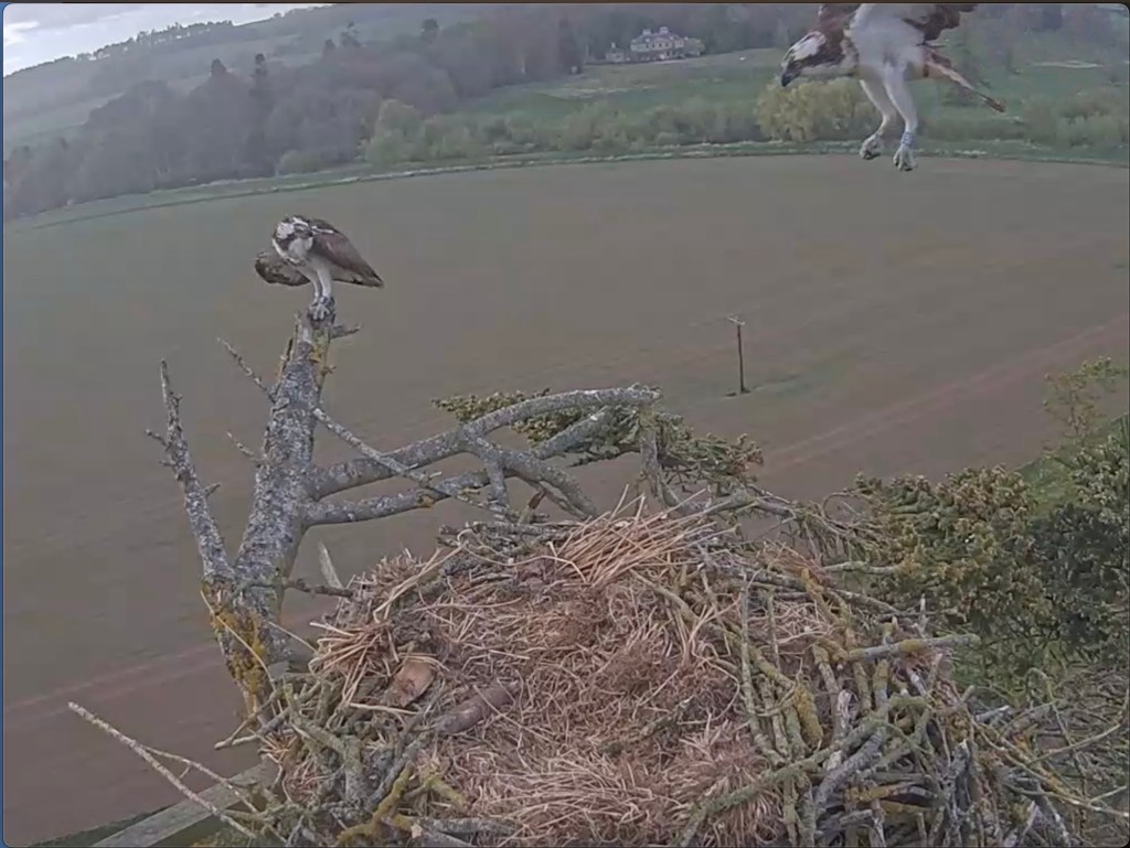 We have had three osprey intruders since Samson returned. On 15 Apr, we had a left leg ringed male osprey do a couple of low level attacks on the nest but without stopping. He came in so fast that it was impossible to read the ring number but he did not land as both resident birds successfully guarded the nest (even though Augusta fell off after the second pass).