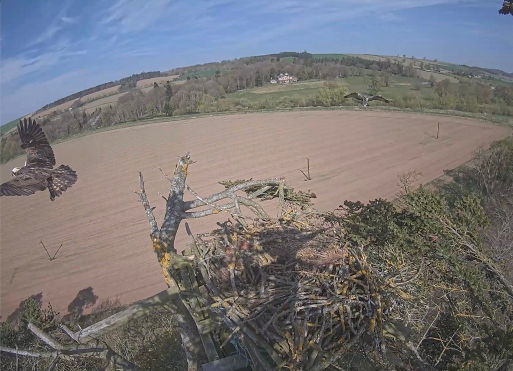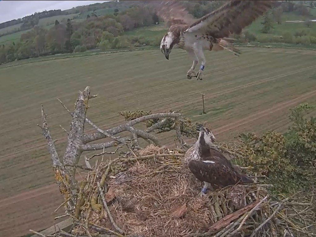 Just before noon, he came back onto the nest and was keenly watching something above him which seemed to be circling and getting closer. He took off as it approached but circled back immediately when he realised that it was Blue 500 (Augusta), who hadn’t been seen on camera since 8th April but clearly had, as I had speculated in my last blog, been wandering around but keeping a close eye on her home nest.