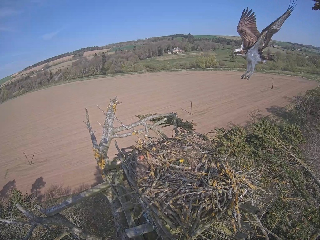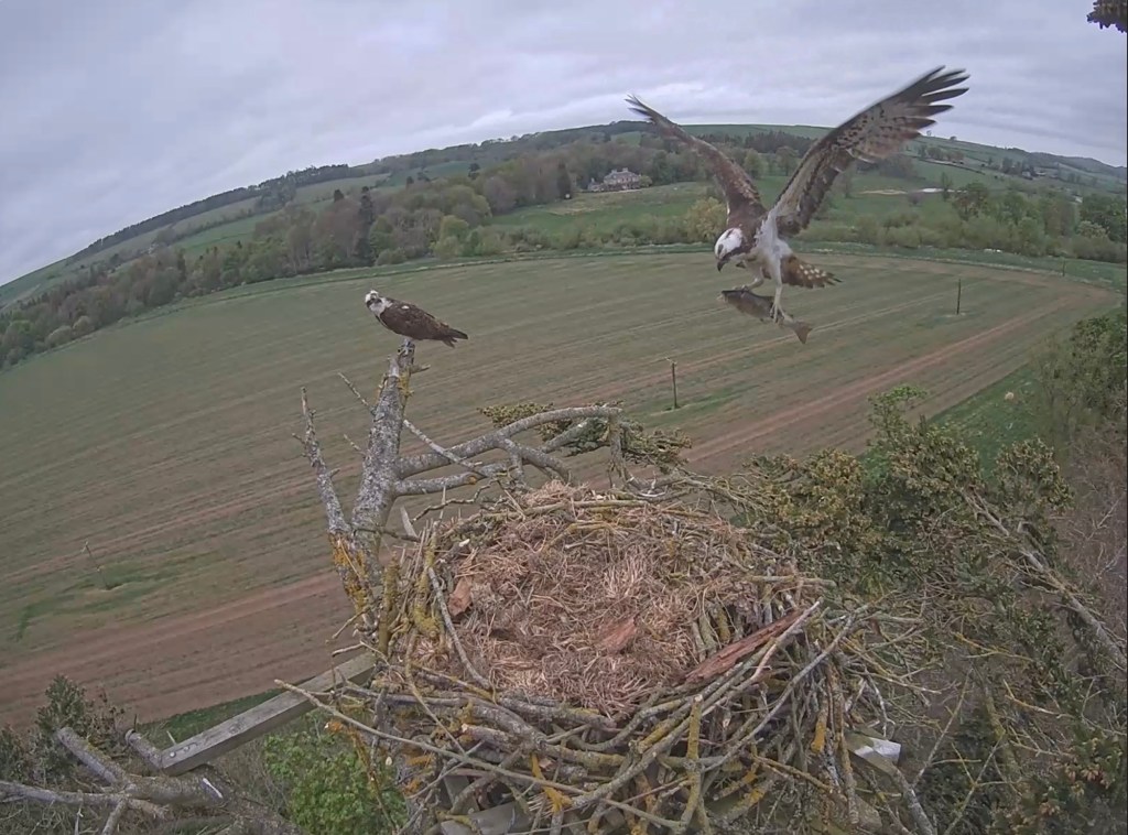 Anyway, it wasn’t enough to stop Augusta and she very quickly stood up after laying and backed off the eggs to show Samson the latest arrival. He was less excited than 3 days ago but his quick circular flight from the nest perch to the nest was enough to show him a far more interesting sight; Augusta had left some of the large trout he’d brought in earlier and he quickly grabbed it and flew off again to consume it away from the nest.